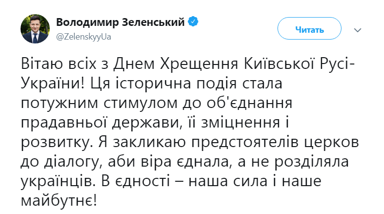 Обращение Зеленского к предстоятелям церквей следует за поздравлением всех православных с годовщиной крещения Руси.
