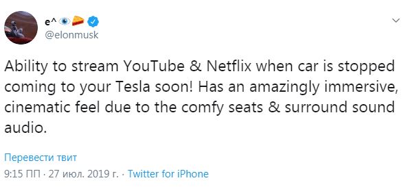 По его словам, для просмотра видео можно использовать большой монитор, который устанавливается в салоне электрокаров Tesla. "Благодаря объемному звуку и удобным сидениям в автомобилях Tesla будет непередаваемое ощущение кинематографичности", - написал Маск.