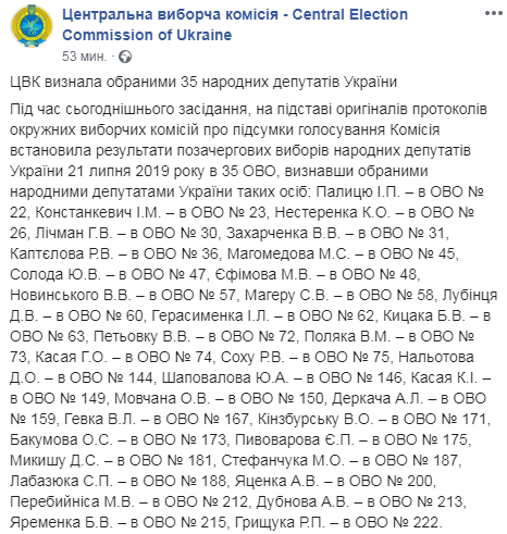 По состоянию на 26 июля ЦИК обработала 100% электронных протоколов. Согласно этим результатам в парламент проходят пять партий: "Слуга народа" (получила 43,16% голосов); "Оппозиционная платформа - За жизнь" (13,05%); ВО "Батькивщина" (8,18%), "Европейская солидарность" (8,10%), ВО "Голос" (5,82%).