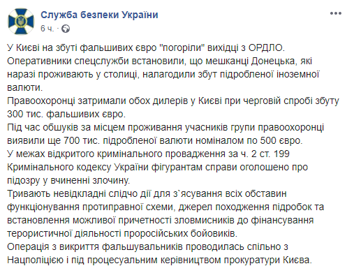 Сотрудники СБУ в Киеве задержали фальшивомонетчиков, выходцев из Донецка, которые наладили сбыт поддельной иностранной валюты в столице. Об этом сообщает пресс-служба СБУ в Facebook.