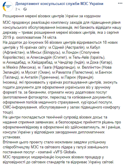 В сообщении говорится, что внешнеполитическое ведомство продолжает реализацию комплекса мероприятий для повышения уровня консульского обслуживания иностранцев, желающих посетить Украину - продолжается расширение сети визовых центров, которая с августа 2019 года будет охватывать 74 города.