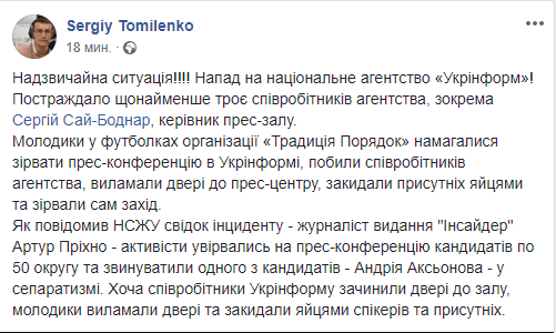 Отмечается, что во время пресс-конференции в Укринформе, на которой кандидаты в депутаты по округу №50 собрались рассказать о фальсификации на выборах, самовыдвиженца Андрея Аксенова молодчики в футболках с надписью "Традиция и порядок" облили водой и забросали яйцами. По данным издания, парни выбили входную дверь в зал и вбежали с криками "Сепаратист Аксенов!", "Позор".