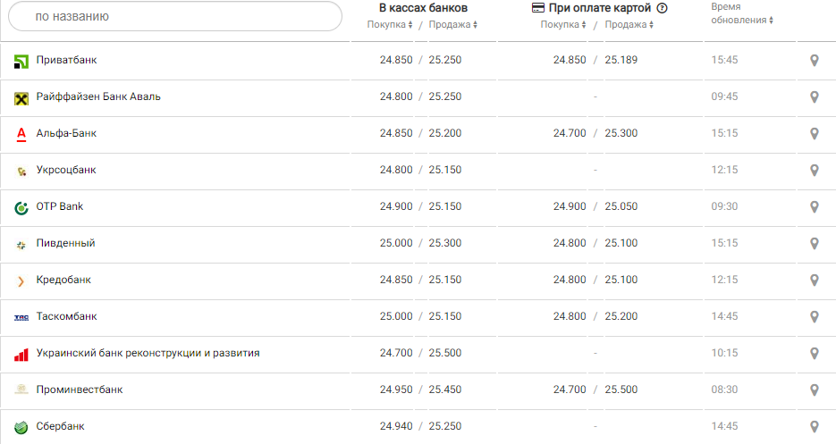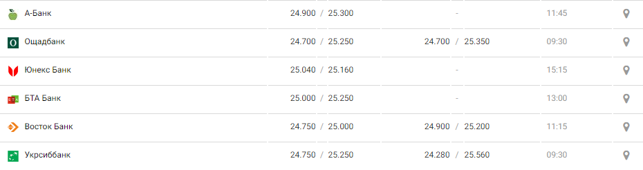 К 11:00 долларом торговали больше, чем покупали. В итоге он упал ниже 25 грн: 24,94 грн - покупка и 24,97 грн - продажа.