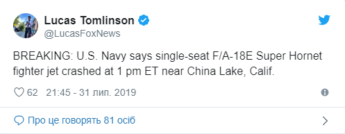 "По информации ВМС США, одноместный истребитель F/A-18E "Супер Хорнет" упал около часа дня вблизи Чайна Лейк, штат Калифорния", - написал он.