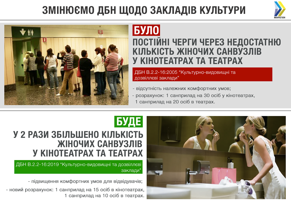 "С 1 ноября вступают в действие новые строительные нормы относительно учреждений культуры, которые в 2 раза увеличивают количество женских туалетов в кинотеатрах и театрах при их новом строительстве или реконструкции. Теперь расчет такой: 1 санитарный прибор на 15 человек в кинотеатрах и 1 санприбор на 10 человек в театрах. Их количество будет определяться расчетной вместимостью этих заведений", - уточнил Парцхаладзе.