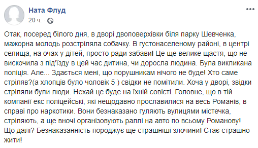 "Вот так, посреди белого дня, во дворе двухэтажки возле парка Шевченко мажорная молодежь расстреляла собачку. В центре поселка, на глазах у детей, просто ради забавы! Это еще большое счастье, что не выскочил из подъезда в это время ребенок, или взрослый человек", - пишет в Facebook пользователь Ната Флуд.