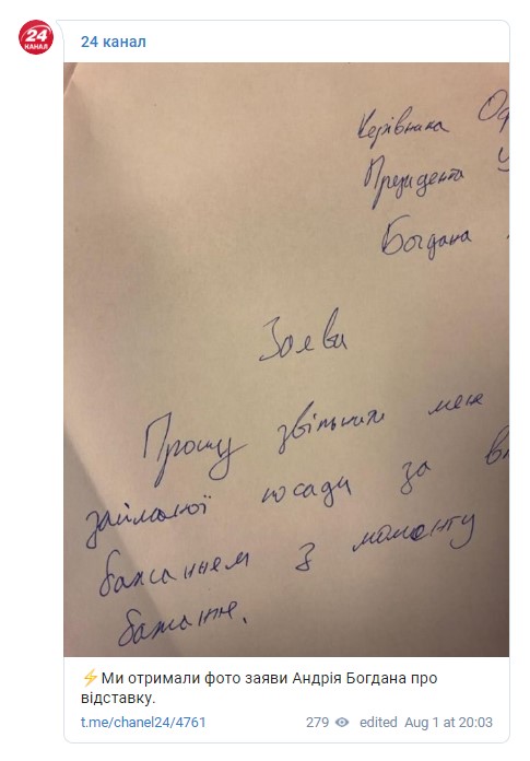 В частности, 24 канал даже опубликовал якобы фотографию заявления руководителя ОПУ. На опубликованном фото нет подписи Богдана или даты. Кроме того, якобы заявление заканчивается словами "с момента желания".