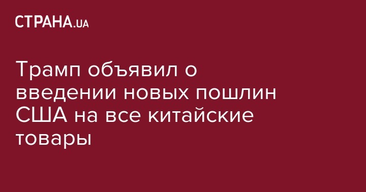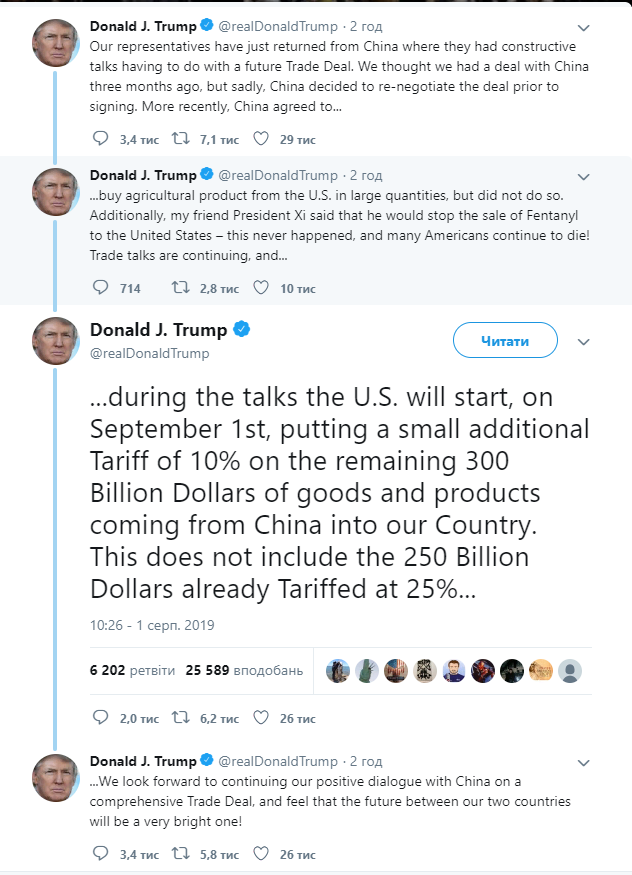 "Торговые переговоры продолжаются, и во время этих переговоров США начнут 1 сентября вводить небольшие дополнительные пошлины в размере 10% на оставшиеся товары и продукты, идущие в нашу страну из Китая, на сумму $300 млрд", - написал Трамп на своей странице в Twitter.