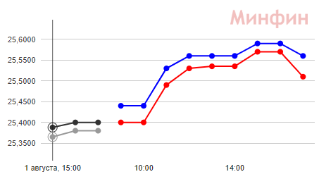 Утром 2 августа покупка 25,2-25,4, продажа - 25,6-25,7 грн.