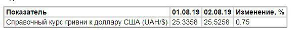 Сообщается, что справочный курс гривни к доллару США на межбанковском валютном рынке по состоянию на 12:00 2 августа 2019 года составляет 25,53 грн/$1.