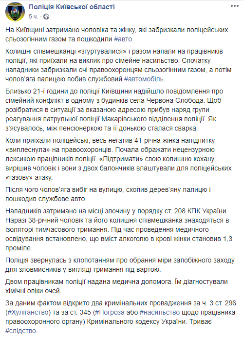 В одном из домов села Красная Слобода в Киевской области бывшие сожители совершили нападение на сотрудников полиции, применив слезоточивый газ, а также повредив их автомобиль, передает пресс-служба Нацполиция в соцсети Facebook.