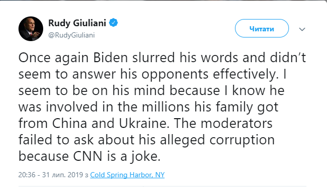 Адвокат американского президента Дональда Трампа Рудольф Джулиани обвинил бывшего вице-президента США Джо Байдена в том, что его семья получала миллионы из Китая и Украины. Об этом он написал на своей странице в Твиттере.