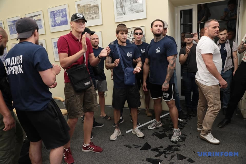 30 июля в здании "Укринформа" состоялось побоище. Агрессивные люди в футболках организации "Традиция и порядок" сорвали пресс-конференцию, посвященную фальсификациям в округе №50. Они выбили входную дверь в зал и вбежали с криками "Сепаратист Аксенов!", "Ганьба", после чего облили водой и забросали яйцами кандидата Аксенова.