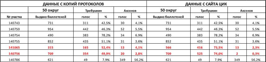 Проблемы возникли на двух участках округа - 141065 и 140756. В частности, на первом из них по данным из копий протоколов результат оказался таковым: Требушкин (165) - Аксенов (13), то есть +152 голоса в пользу первого. Во втором участке: Требушкин (354) - Аксенов (20) и +334 в пользу Требушкина. В сумме +486 в пользу Требушкина.