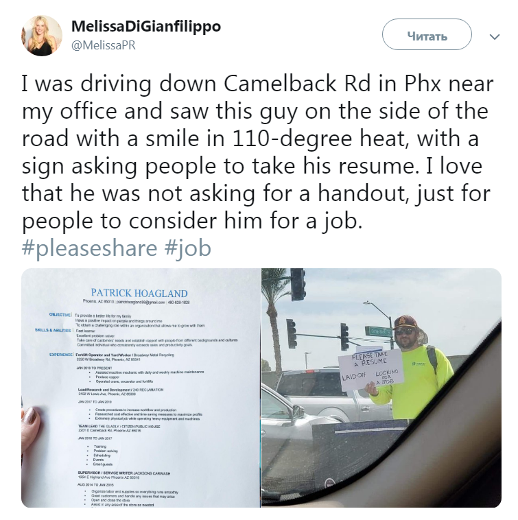 Житель Феникса (Аризона, США) Патрик Хогленд работал оператором погрузчика на металлоперерабатывающем заводе, но был уволен. Он разослал резюме многим компаниям, но не получил ни одного приглашения на собеседование. Тогда он распечатал 200 копий своих данных, взял табличку с надписью "Меня уволили, ищу работу, пожалуйста, возьмите резюме" и стал раздавать резюме на одной из улиц.