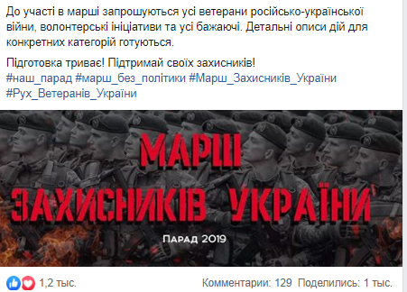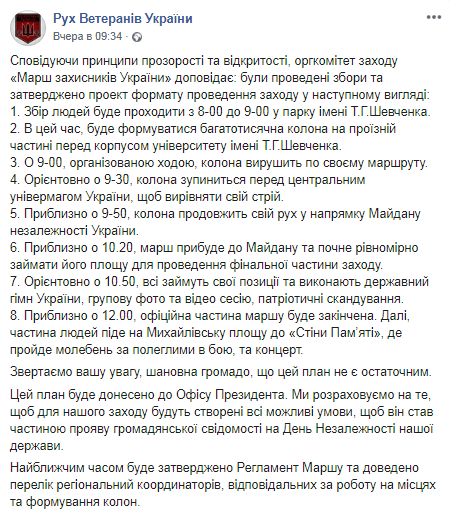 "Этот план будет донесен до Офиса Президента. Мы рассчитываем на то, что для нашего мероприятия будут созданы все возможные условия, чтобы оно стало частью проявления гражданского сознания на День Независимости нашего государства... К участию в марше приглашаются все ветераны российско-украинской войны, волонтерские инициативы и все желающие", - сказано в сообщении.