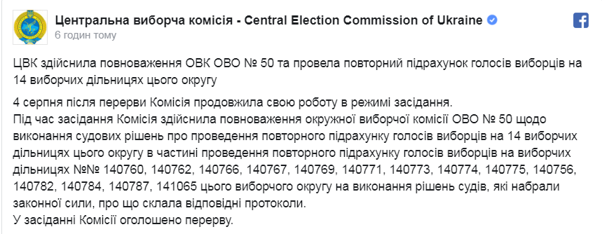 Центральная избирательная комиссия Украины (ЦИК) повторно пересчитала голоса на скандальном одномандатном округе №50 в Покровске Донецкой области.