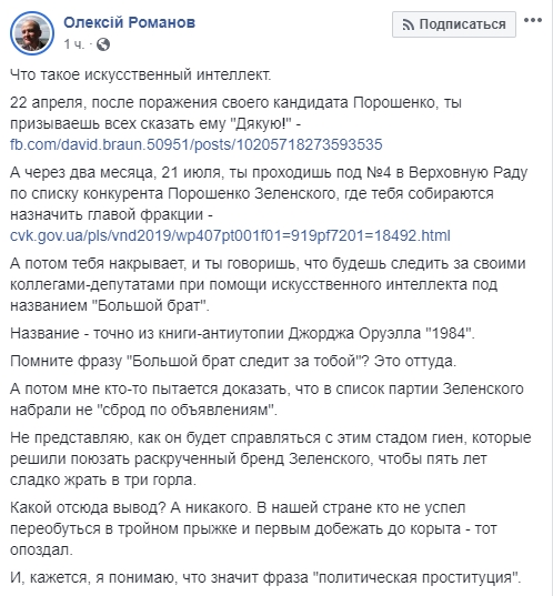Харьковский юрист Алексей Романов: "Что такое искусственный интеллект. 22 апреля, после поражения своего кандидата Порошенко, ты призываешь всех сказать ему "Дякую!". А через два месяца, 21 июля, ты проходишь под №4 в Верховную Раду по списку конкурента Порошенко Зеленского, где тебя собираются назначить главой фракции.