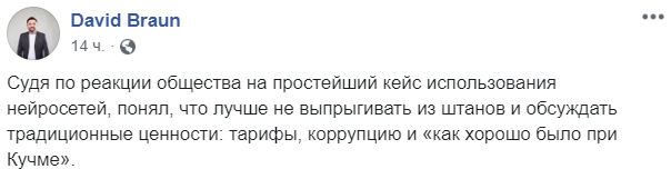 "Судя по реакции общества на простейший кейс использования нейросетей, понял, что лучше не выпрыгивать из штанов и обсуждать традиционные ценности: тарифы, коррупцию и "как хорошо было при Кучме"".