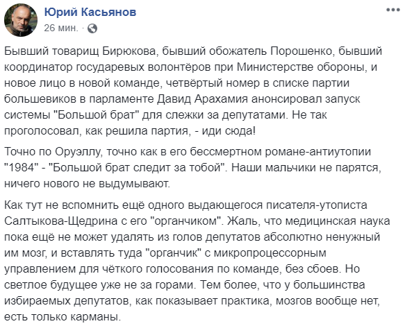 "Бывший товарищ Бирюкова, бывший обожатель Порошенко, бывший координатор государевых волонтёров при Министерстве обороны, и новое лицо в новой команде, четвёртый номер в списке партии большевиков в парламенте Давид Арахамия анонсировал запуск системы "Большой брат" для слежки за депутатами. Не так проголосовал, как решила партия, - иди сюда!