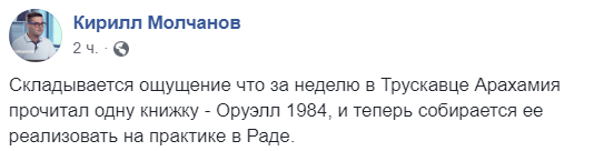 "Складывается ощущение что за неделю в Трускавце Арахамия прочитал одну книжку - Оруэлл 1984, и теперь собирается ее реализовать на практике в Раде", - иронизирует блогер Кирилл Молчанов.
