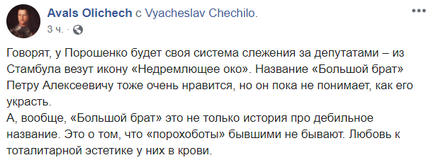 А, вообще, "Большой брат" это не только история про дебильное название. Это о том, что "порохоботы" бывшими не бывают. Любовь к тоталитарной эстетике у них в крови", - пишет журналист с намеком на порохоботское прошлое Арахамии.
