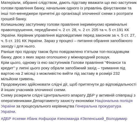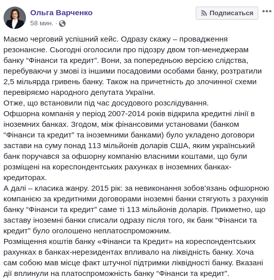 "Имеем очередной успешный кейс. Сразу скажу - производство резонансное. Сегодня объявили о подозрении двум топ-менеджерам банка" Финансы и кредит". Они, по предварительной версии следствия, находясь в сговоре с другими должностными лицами банка, растратили 2,5 миллиарда гривен банка. Также на причастность к преступной схемы проверяем народного депутата Украины ".