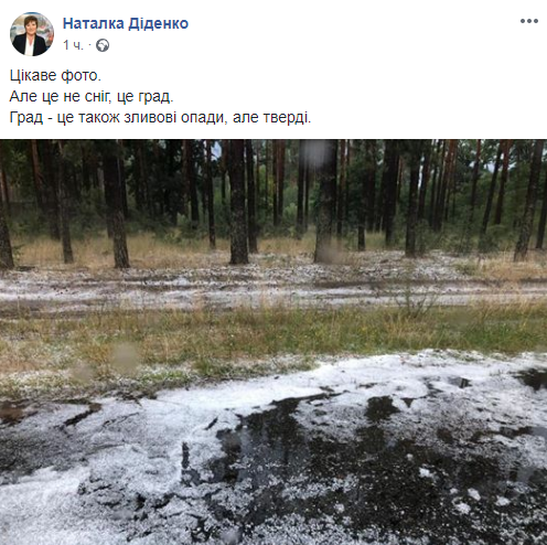 На фото летнего снега отреагировала известный синоптик Наталья Диденко. Она успокоила украинцев, что это не снег, а град, который является твердой формой осадков.