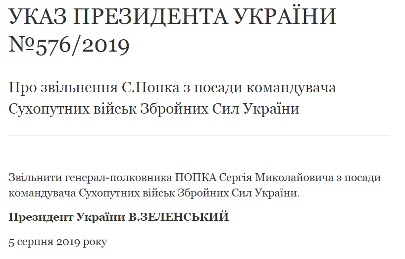 5 августа президент Украины Владимир Зеленский уволил Сергея Попко с должности командующего Сухопутными войсками Вооруженных сил Украины и назначил его преемника. Соответствующие указы появились на сайте главы государства.