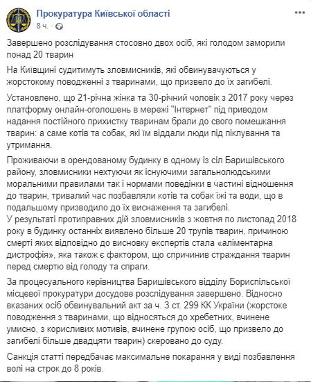 Под процессуальным руководством Барышевского отдела Бориспольской местной прокуратуры досудебное расследование завершено. В отношении указанных лиц обвинительный акт по ч. 3 ст. 299 УК Украины (жестокое обращение с животными, относящимися к позвоночным, совершенное умышленно, из корыстных побуждений, совершенное группой лиц, что привело к гибели более двадцати животных) направлено в суд.