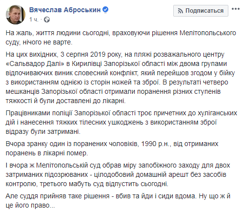 Мужчин, принимавших участие в драке с поножовщиной в Кирилловке, в результате которой погиб 29-летний парень, отпустили под домашний арест. Об этом заместитель главы Нацполиции Вячеслав Аброськин написал в Facebook.