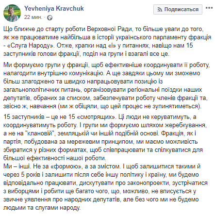 "Чем ближе к старту работы Верховной Рады, тем больше внимания к тому, как же будет работать крупнейшая в истории украинского парламента фракция - "Слуги народа". Итак, точки над "и" в вопросах, зачем нам 15 заместителей председателя фракции, разделение на группы и вообще все это", - написала Кравчук.