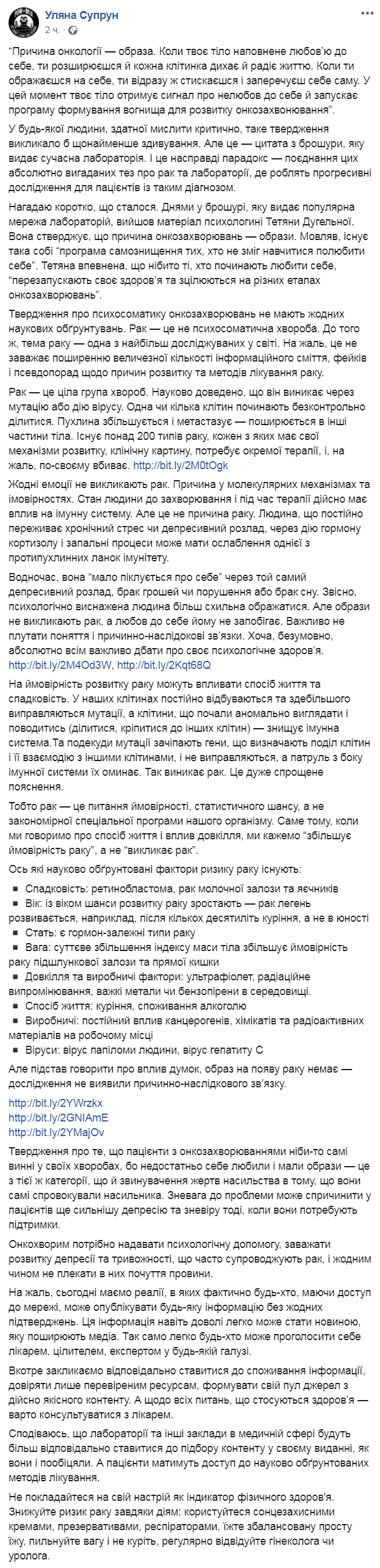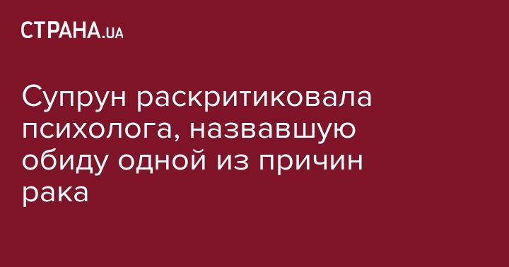 И. о. министра здравоохранения Ульяна Супрун выступила против психолога Татьяны Дугельной, которая утверждает, будто рак может возникнуть из-за нелюбви к себе и обиды. Пост критического содержания чиновница опубликовала на своем Facebook.