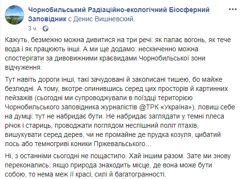 "Говорят, бесконечно можно смотреть на три вещи: как горит огонь, как течет вода и как работают другие. А мы еще добавим: бесконечно можно наблюдать за удивительными пейзажами Чернобыльской зоны отчуждения. Здесь даже дороги другие, такие убаюканные тишиной, ибо почти безлюдны. А потому, в очередной раз очутившись среди этих просторов и картинных пейзажей, ловишь себя на мысли: здесь не надоедает быть. Не надоедает заглядывать в темные плесы рек и стариц, провожать взглядом неспешный полет птиц, выискивать среди деревьев, не мелькнет где прыткая косуля, долговязый лось или темногривые лошадки Пржевальского… Нет, с последними сегодня не повезло. Пусть в другой раз. Зато мы снова убедились: если природа находит место, где она может быть собой, то нет предела ее красоте, силе и многогранности", - говорится в сообщении.
