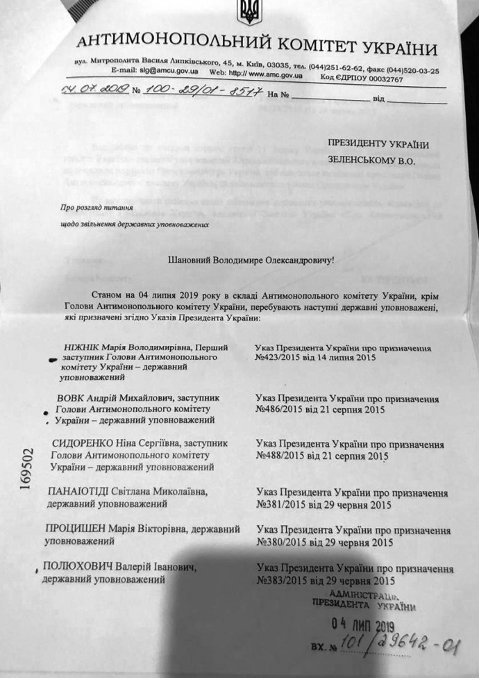 Председатель АМКУ перечислил фамилии всех восьми госуполномоченных, которые по состоянию на 4 июля находились в составе Комитета. И попросил "принять решение об увольнении государственных уполномоченных, в соответствии с компетенцией президента Украины, определенной законом Украины "Об Антимонопольном комитете Украины".