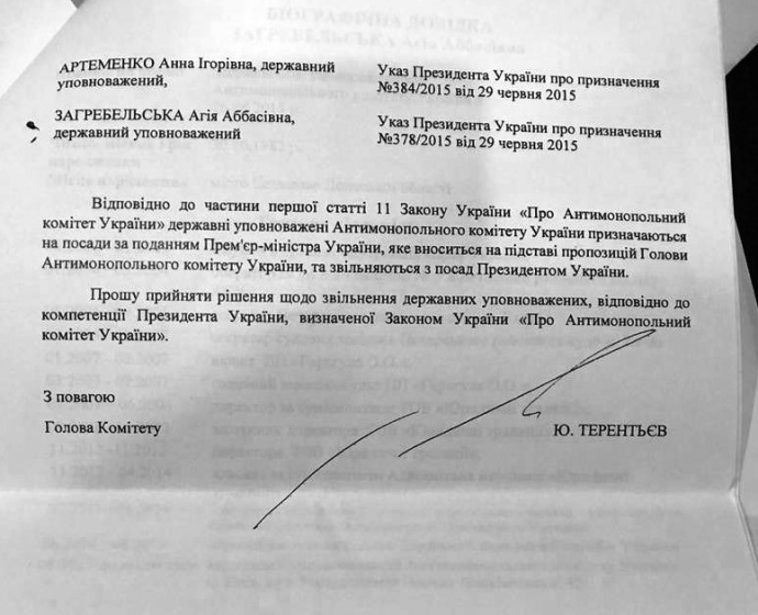 После этого 5-8 июля были обнародованы президентские указы об увольнении четырех членов Комитета - Марии Нижник, Агии Загребельской, Андрея Вовка и Валерия Полюховича. "В перечень Юрий Терентьев добавил свою интерпретацию ч.1 ст.11 Закона "Об Антимонопольном комитете Украины" о том, что "государственные уполномоченные ... освобождаются с должностей Президентом Украины", - пишет издание.