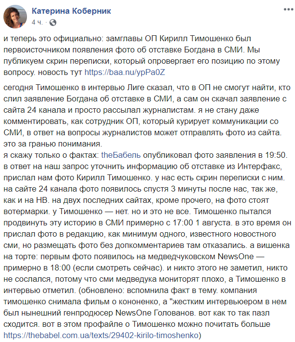 В частности, шеф-редактор издания "theБабель" Катерина Коберник заявляет, что не 24 канал, а "замглавы ОП Кирилл Тимошенко был первоисточником появления фото об отставке Богдана в СМИ".