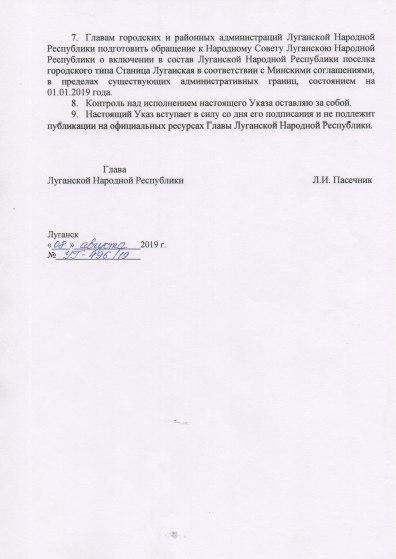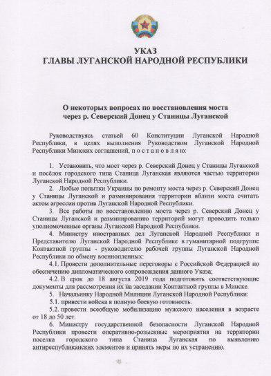 Отметим, что ранее по украинским СМИ прошел скрин якобы "указа" главы т.н. "ЛНР" Леонида Пасечника, которым он поручил включить Станицу Луганскую в состав территории "республики".