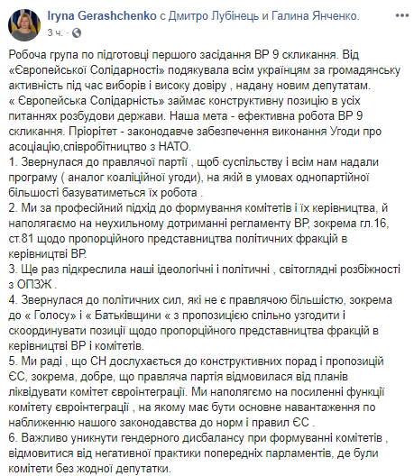 "("Европейская солидарность" - Ред.) обратилась к политическим силам, которые не являются правящим большинством, в частности, к "Голосу" и "Батькивщине" с предложением совместно согласовать и скоординировать позиции относительно пропорционального представительства фракций в руководстве ВР и комитетов", - написала Геращенко.