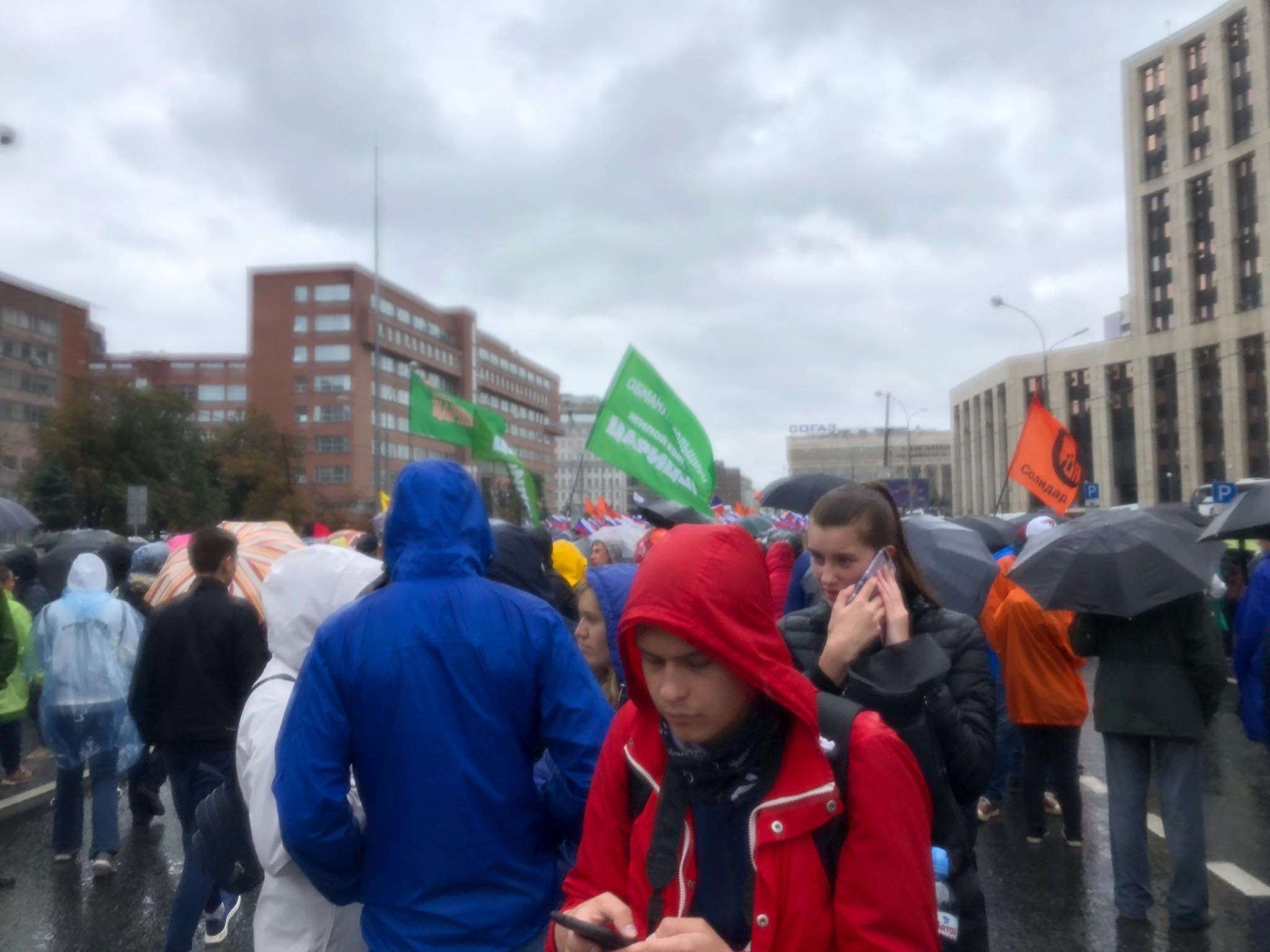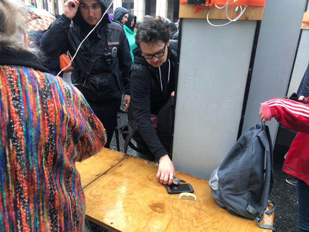 13.49 Несмотря на дождь москвичи идут на митинг и выстраиваются в очередь у рамок металлодетекторов.