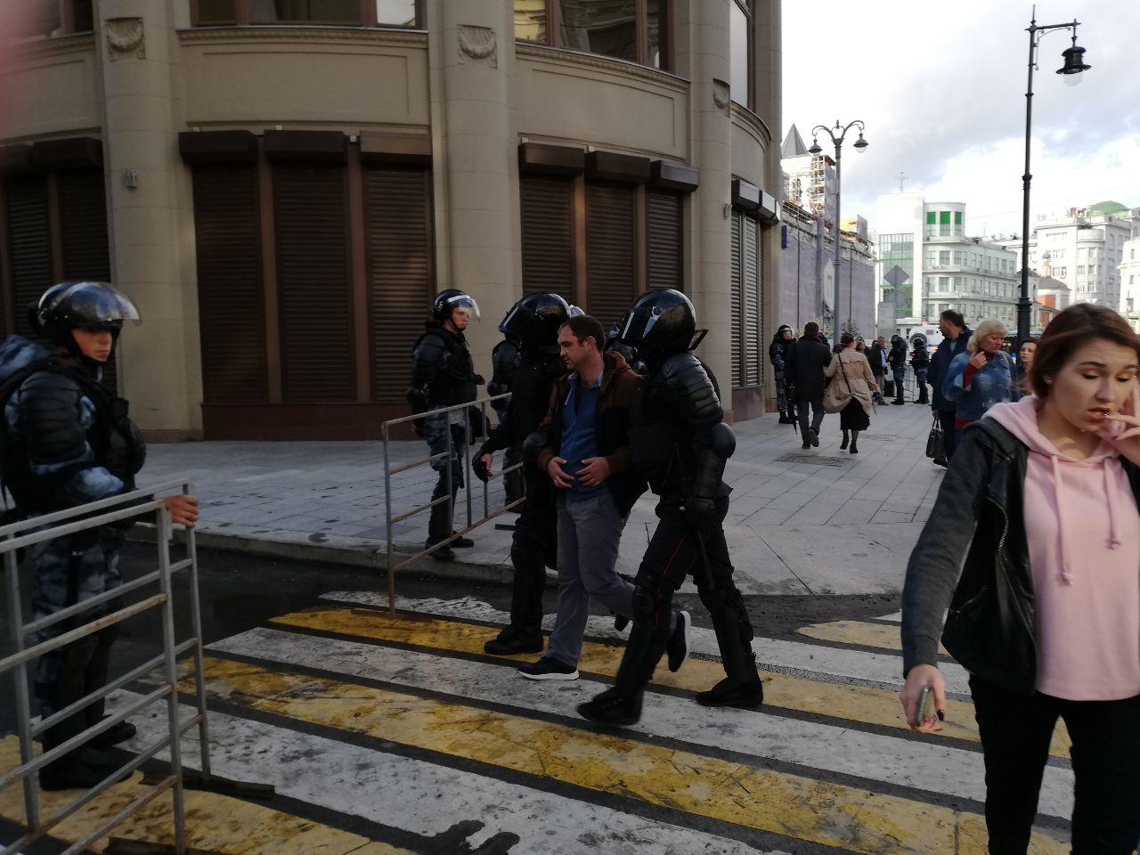 Так, издание "Медуза" пишет о задержаниях на Чистопрудном бульваре и у метро "Китай-город". Также "Медуза" передает о том, что проход по многим улицам в центре столицы РФ перекрыт полицией.