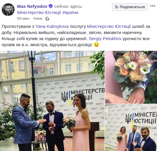 "Протестировали услугу Министерства Юстиции брак за сутки. Нормально получилось, самое сложное, конечно, уговорить невесту. Кольцо себе купил за час до церемонии", - написал Нефедов. Также он отметил, что торжество провел заместитель министра юстиции Сергей Петухов.