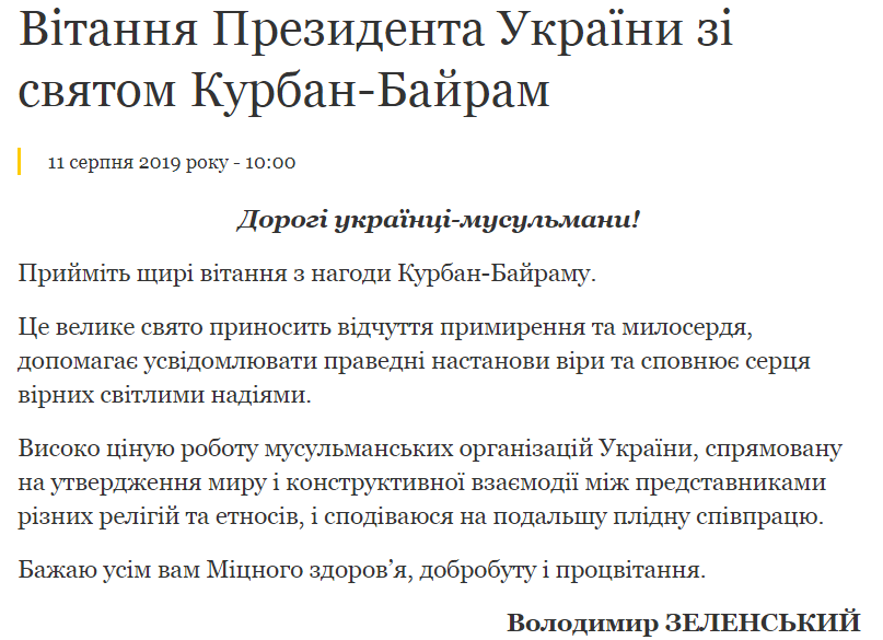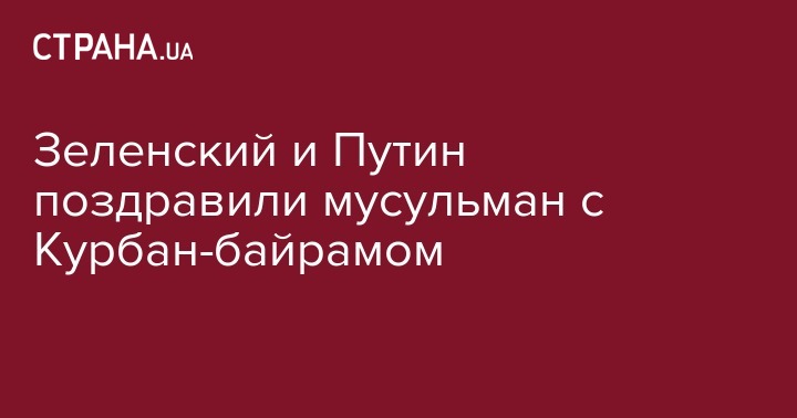 Президент Украины Владимир Зеленский и президент России Владимир Путин одновременно поздравили мусульман своих стран с праздником Курбан-байрам. Поздравления глав государств появились на сайте президента Украины и сайте Кремля.