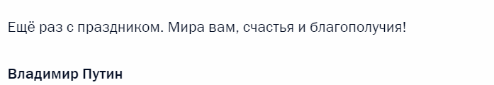 Как ни странно такое совпадение, но обращение Путина тоже заканчивается приятными пожеланиями: "Мира вам, счастья и благополучия!"