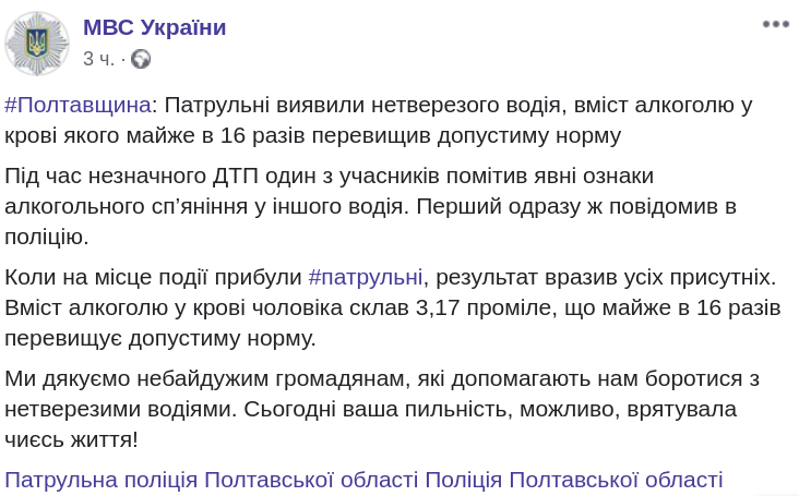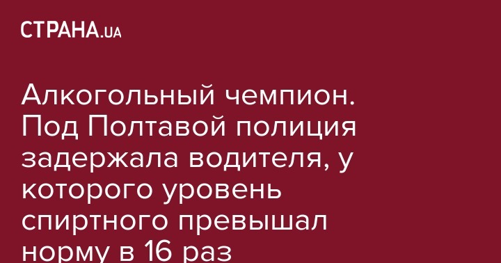 В Полтавской области во время незначительного ДТП один из его участников заметил явные признаки алкогольного опьянения у другого водителя, о чем сразу же сообщил полиции. После проверки на драгере полицейские были немало изумлены. Уровень алкоголя превышал норму в 16 раз.