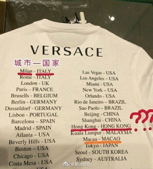 На футболках города Макао и Гонконг, имеющие статус специальных административных районов Китая, были отмечены как отдельные государства. Фотографии таких футболок опубликовали пользователи китайских соцсетей, что вызвало критику в адрес Versace.