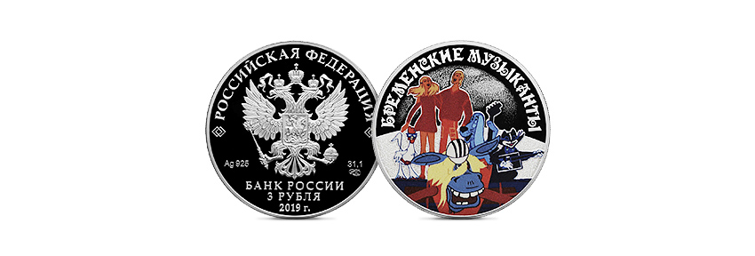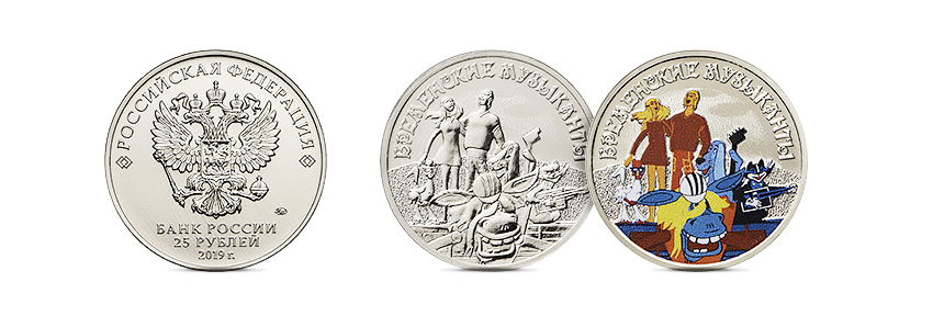 Памятные монеты "Бременские музыканты" войдут в серию "Российская (советская) мультипликация". Они будут выполнены в трех вариантах: серебряная монета номиналом 3 рубля (тираж 3 тыс. штук), две монеты из недрагоценных металлов номиналом 25 рублей. Они изготовлены в обычном и специальном (с цветным изображением) вариантах, а их тираж составит 450 тыс. и 50 тыс. штук соответственно.