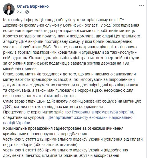 "Именно сейчас следователи ГБР осуществляют 7 санкционированных обысков на таможнях ГФС, таможенных постах и отделах таможенного оформления", - сообщила она. Варченко добавила, что во время следствия сотрудники бюро установили причастность к противоправной схеме сотрудников таможен на Волыни.