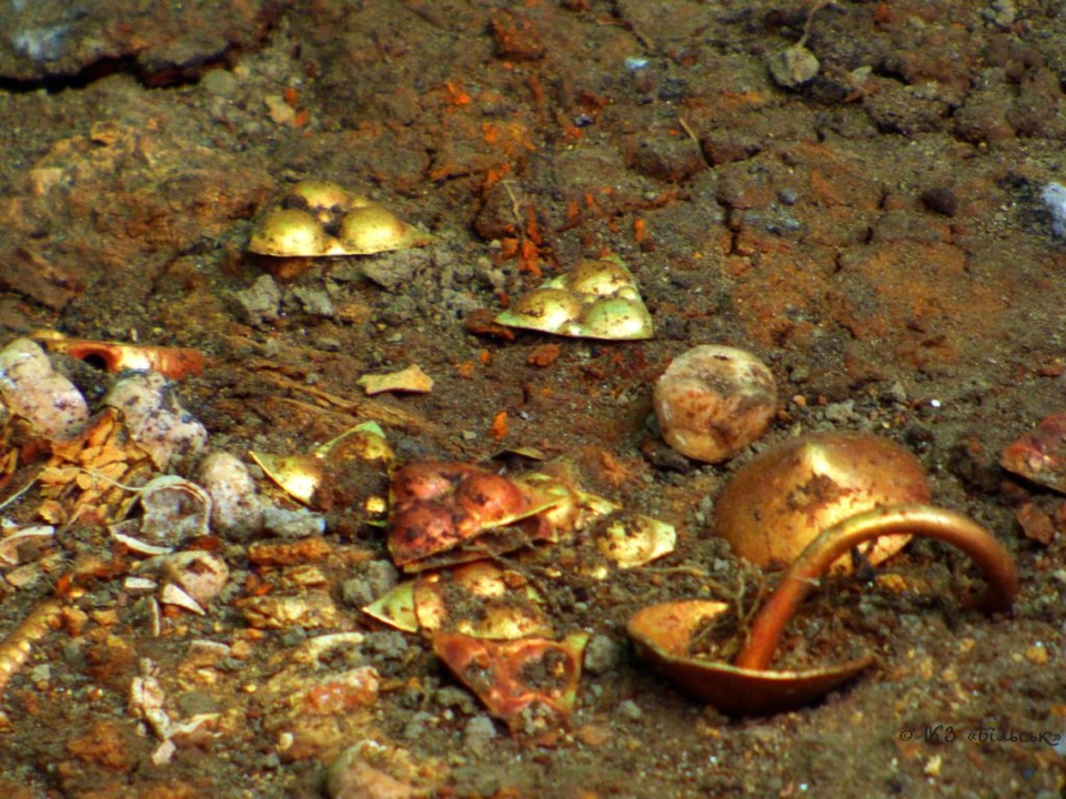 А также уточняется, что зеркало и браслет изготовлены из бронзы, бусины - из янтаря, хрусталя и сердолика, из желтого металла (золота) - серьги. От черпаков, кочерги, тарелок и другой керамики домашнего обихода остались только обломки.