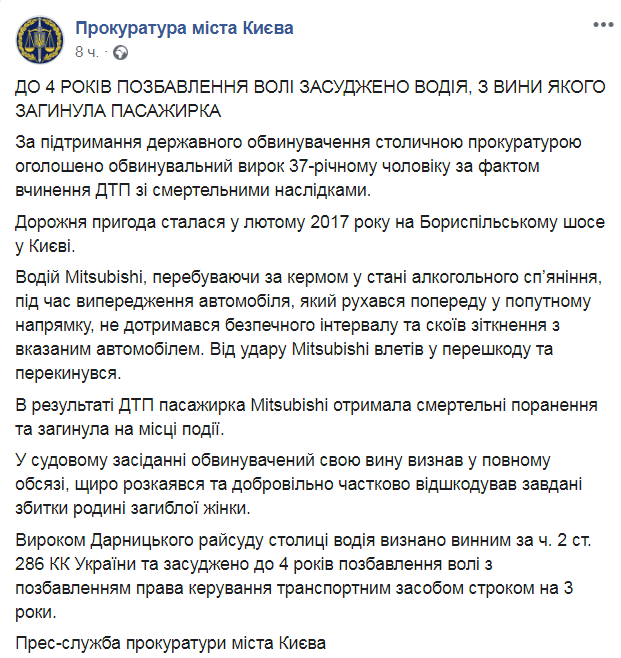 Столичная прокуратура вынесла обвинительный приговор 37-летнему мужчине, который спровоцировал ДТП со смертельным исходом. Об этом пресс-служба прокуратуры Киева сообщает на своем Facebook.